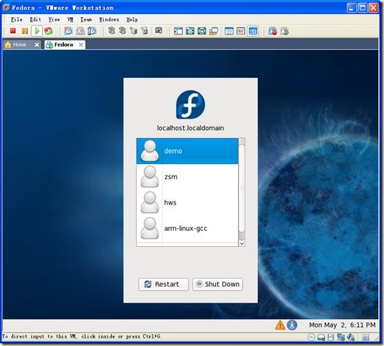 安装完毕Fedora后,就可以从虚拟工作站中启动Fedora Linux系统了。系统桌面如下: