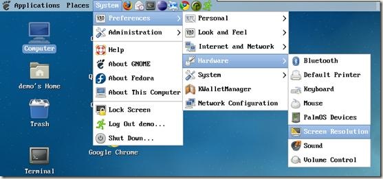 【System】--【Preferences】--【Hardware】--【Screen Resolution】