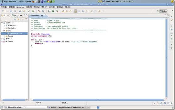 然后就是下面就是Eclispe的IDE环境了,有过Windows下的Java编程经验的人来说,这个界面是再熟悉不过了,完全可以直接过渡到Linux下的C/C++程序开发上来,这样就极大地减少了程序员的学习周期。