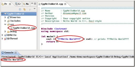 点击Finish,然后Eclispe就会建立一个基于C++的HelloWorld项目,运行程序后,能够在控制台中输出“Hello World”: