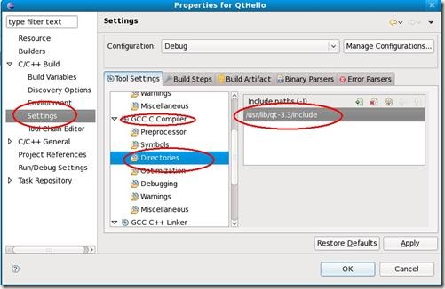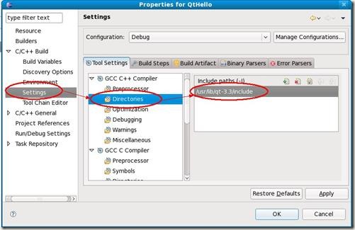 【GCC C++ Compiler】--【Directories】添加包含的文件路径:/usr/lib/qt-3.3/include。这个是C++的编译器包含的头文件路径,因为是建立的C++ Project,所以一定要设置。