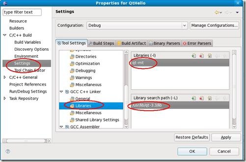 在Eclipse中对项目Build选项进行设置,对Qt库进行连接,然后就可以进行Linux下的Qt程序进行开发了。