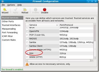 2.如果Linux系统的SSH连接不上,则一般情况下是Linux系统开启了SSH的防火墙,则只需要在Linux系统中对防火墙进行相关设置,关闭针对SSH的防火墙。【System】--【Administration】--【Firewall】,然后勾选全能SSH。