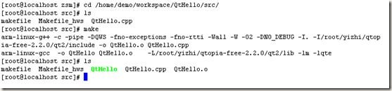 ############################################################################## Makefile for building hello# Generated by tmake at 20:58, 2011/04/14# Project: hello# Template: app#################################################################################### Compiler, tools and optionsCC = arm-linux-gccCXX = arm-linux-g++CFLAGS = -pipe -Wall -W -O2 -DNO_DEBUGCXXFLAGS= -pipe -DQWS -fno-exceptions -fno-rtti -Wall -W -O2 -DNO_DEBUGINCPATH = -I. -I$(QTDIR)/includeLINK = arm-linux-gccLFLAGS =LIBS = $(SUBLIBS) -L$(QTDIR)/lib -lm -lqteMOC = $(QTDIR)/bin/mocUIC = $(QTDIR)/bin/uicTAR = tar -cfGZIP = gzip -9f####### FilesTARGET = QtHelloHEADERS = $(TARGET).hSOURCES = $(TARGET).cppOBJECTS = $(TARGET).oDIST =INTERFACE_DECL_PATH = .####### Implicit rules.SUFFIXES: .cpp .cxx .cc .C .c.cpp.o:$(CXX) -c $(CXXFLAGS) $(INCPATH) -o $@ $<.cxx.o:$(CXX) -c $(CXXFLAGS) $(INCPATH) -o $@ $<.cc.o:$(CXX) -c $(CXXFLAGS) $(INCPATH) -o $@ $<.C.o:$(CXX) -c $(CXXFLAGS) $(INCPATH) -o $@ $<.c.o:$(CC) -c $(CFLAGS) $(INCPATH) -o $@ $<####### Build rulesall: $(TARGET)$(TARGET): $(OBJECTS)$(LINK) $(LFLAGS) -o $(TARGET) $(OBJECTS) $(LIBS)dist:$(TAR) hello.tar hello.pro $(SOURCES) $(HEADERS) $(INTERFACES) $(DIST)$(GZIP) hello.tarclean:-rm -f $(OBJECTS) $(OBJMOC) $(SRCMOC) $(UICIMPLS) $(UICDECLS) $(TARGET)-rm -f *~ core####### Sub-libraries###### Combined headers####### Compile$(TARGET).o: $(TARGET).cpp用zsm账号登录(因为关于arm-Qt库的编译环境变量是在此账号中设置的),然后执行如下步骤:
