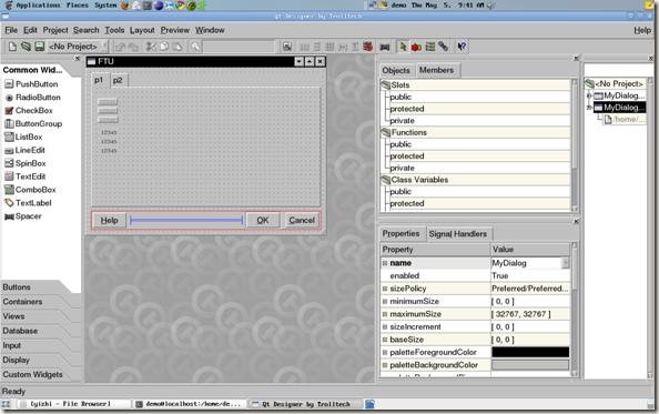 在Linux系统中打开Qt Designer,然后进行可视化窗口设计。然后点击保存为mydialog.ui文件。