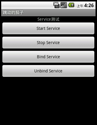 <?xml version="1.0" encoding="utf-8"?><LinearLayout xmlns:android="http://schemas.android.com/apk/res/android" android:orientation="vertical" android:layout_width="fill_parent" android:layout_height="fill_parent" ><TextView android:layout_width="fill_parent" android:layout_height="wrap_content" android:text="Service测试" android:gravity="center_horizontal" /><Button android:id="@+id/startButton" android:layout_width="fill_parent" android:layout_height="wrap_content" android:text="Start Service"/><Button android:id="@+id/stopButton" android:layout_width="fill_parent" android:layout_height="wrap_content" android:text="Stop Service"/><Button android:id="@+id/bindButton" android:layout_width="fill_parent" android:layout_height="wrap_content" android:text="Bind Service"/><Button android:id="@+id/unBindButton" android:layout_width="fill_parent" android:layout_height="wrap_content" android:text="Unbind Service"/></LinearLayout>