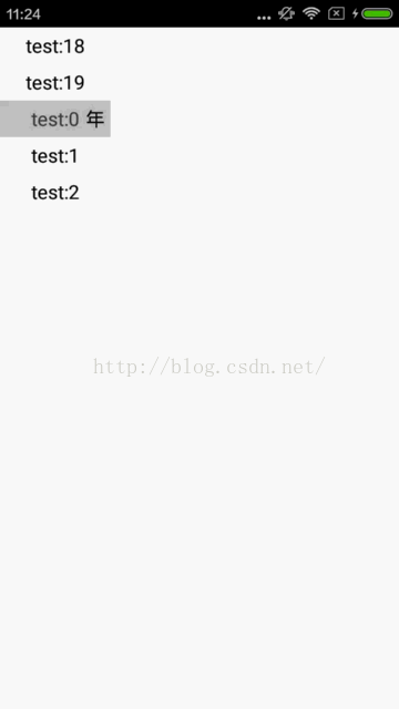 final WheelView wheelView = (WheelView) findViewById(R.id.wheelView); final List<String> lists = new ArrayList<>(); for(int i = 0; i < 20; i++){lists.add("test:" + i); } wheelView.lists(lists).fontSize(35).showCount(5).selectTip("年").select(0).listener(new WheelView.OnWheelViewItemSelectListener() {@Overridepublic void onItemSelect(int index) {Log.d("cc", "current select:" + wheelView.getSelectItem() + " index :" + index + ",result=" + lists.get(index));} }).build();
