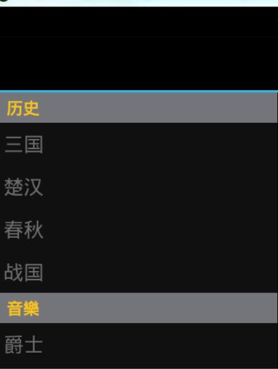 public class PageFragment extends Fragment {public final static String ITEM_POSITION_NUMBER = "item_position_num";public PageFragment(){}@Overridepublic View onCreateView(LayoutInflater inflater, ViewGroup container,Bundle savedInstanceState) { View convertView = inflater.inflate(R.layout.page_fragment_layout, null); TextView tv = (TextView) convertView.findViewById(R.id.textView); int num = getArguments().getInt(ITEM_POSITION_NUMBER); //从res/array中获取list数据 String[] dynastyList = getResources().getStringArray(R.array.list_item); tv.setText(dynastyList[num]); return convertView;} }代码中可以看出当我们在左侧菜单中选择SelectItem时会把对应的值显示到内容区。private ListView menuList;private String[] mMenuTitles;private String[] historyTitles;private String[] musicTitles;private String[] movieTitles;private String[] listTitles; // 历史栏historyTitles = getResources().getStringArray(R.array.history);// 音乐栏musicTitles = getResources().getStringArray(R.array.music);// 电影栏movieTitles = getResources().getStringArray(R.array.movie);// 标题数组mMenuTitles = getResources().getStringArray(R.array.title);// 每一項的標題listTitles = getResources().getStringArray(R.array.list_item);drawLayout = (DrawerLayout) findViewById(R.id.drawer_layout);menuList = (ListView) findViewById(R.id.left_menu);// 设置菜单阴影效果// drawLayout.setDrawerShadow(R.drawable.drawer_shadow,// GravityCompat.START);List<Item> list = new ArrayList<Item>();// 菜单加入历史标题和历史项HeaderItem historyHeader = new HeaderItem(mMenuTitles[0]);list.add(historyHeader);for (int i = 0; i < historyTitles.length; i++) { EventItem historyitem = new EventItem(historyTitles[i]); list.add(historyitem);}// 菜单加入音乐标题和音乐项HeaderItem musicHeader = new HeaderItem(mMenuTitles[1]);list.add(musicHeader);for (int i = 0; i < musicTitles.length; i++) { EventItem musicItem = new EventItem(musicTitles[i]); list.add(musicItem);}// 菜单加入电影标题和电影项HeaderItem movieHeader = new HeaderItem(mMenuTitles[2]);list.add(movieHeader);for (int i = 0; i < movieTitles.length; i++) { EventItem movieItem = new EventItem(movieTitles[i]); list.add(movieItem);}MyListAdapter adapter = new MyListAdapter(this, list);menuList.setAdapter(adapter);这个数据填充有点麻烦。自定义ListAdapter然后进行适配。<?xml version="1.0" encoding="utf-8"?><resources> <string-array name="history"><item >三国</item><item >楚汉</item><item >春秋</item><item >战国</item> </string-array><string-array name="music"><item >爵士</item><item >古典</item><item >现代</item><item >民谣</item> </string-array><string-array name="movie"><item >悬疑</item><item >爱情</item><item >历史</item><item >恐怖</item> </string-array> <string-array name="title"><item >历史</item><item >音樂</item><item >电影</item> </string-array> <string-array name="list_item"><item >歷史</item><item >三国</item><item >楚汉</item><item >春秋</item><item >战国</item><item >音樂</item><item >爵士</item><item >古典</item><item >现代</item><item >民谣</item><item >電影</item><item >悬疑</item><item >爱情</item><item >历史</item><item >恐怖</item> </string-array></resources>然后就是listView的监听: