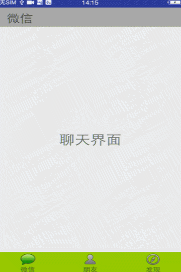 在Activity里面只需要给ViewPager设置上面那个Adapter,设置一个监听知道Pager如何变化即可。点击最下面微信、朋友、发现三个按钮,通过ViewPager的setCurrentItem()方法就能跳转到对应的Pager,除了这些还有就是通过一些简单的逻辑,控制一下界面的改变就行,没有太难的东西。