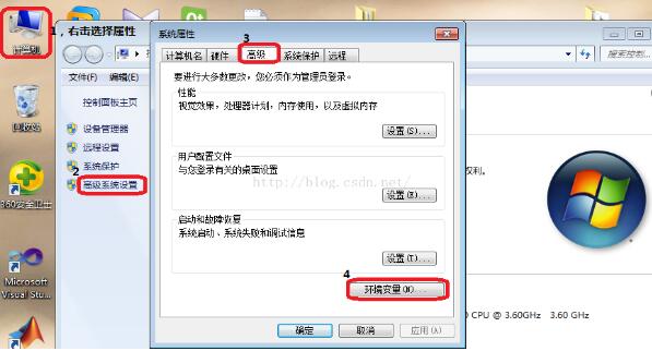 在桌面上,右击计算机 ---》 属性---》 高级环境设置---》 高级---》 环境变量,操作演示如下