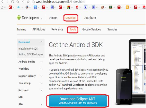 进入安卓开发官方文档的网址http://wear.techbrood.com/,进入该网站后,在菜单栏上面,点击Develop选项,再点击Tools选项,在网页内容中点击按钮”Download Eclipse ADT”如下: