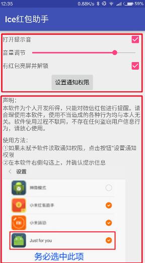 <?xml version="1.0" encoding="utf-8"?><LinearLayout android:id="@+id/root" xmlns:android="http://schemas.android.com/apk/res/android" xmlns:tools="http://schemas.android.com/tools" android:layout_width="match_parent" android:layout_height="match_parent" android:layout_marginLeft="10dp" android:layout_marginRight="10dp" android:layout_marginTop="5dp" android:orientation="vertical" tools:context="com.fndroid.administrator.justforyou.MainActivity"> <LinearLayoutandroid:layout_width="match_parent"android:layout_height="wrap_content"android:orientation="horizontal"><TextView android:layout_width="wrap_content" android:layout_height="wrap_content" android:layout_weight="3" android:text="打开提示音"/><CheckBox android:id="@+id/isMusic" android:layout_width="wrap_content" android:layout_height="wrap_content"/> </LinearLayout> <LinearLayoutandroid:layout_width="match_parent"android:layout_height="wrap_content"><TextView android:layout_width="wrap_content" android:layout_height="wrap_content" android:layout_gravity="center" android:text="音量调节"/><SeekBar android:id="@+id/seekbar" android:layout_width="wrap_content" android:layout_height="wrap_content" android:layout_gravity="center" android:layout_weight="1"/> </LinearLayout> <LinearLayoutandroid:layout_width="match_parent"android:layout_height="wrap_content"android:orientation="horizontal"><TextView android:layout_width="0dp" android:layout_height="wrap_content" android:layout_weight="3" android:text="有红包亮屏并解锁"/><CheckBox android:id="@+id/isUnlock" android:layout_width="wrap_content" android:layout_height="wrap_content"/> </LinearLayout> <Buttonandroid:id="@+id/setPermision"android:layout_width="wrap_content"android:layout_height="wrap_content"android:layout_gravity="center"android:text="设置通知权限"/> <ScrollViewandroid:layout_width="match_parent"android:layout_height="match_parent"><LinearLayout android:layout_width="match_parent" android:layout_height="match_parent" android:orientation="vertical"> <TextViewandroid:layout_width="wrap_content"android:layout_height="wrap_content"android:layout_marginTop="10dp"android:text="声明:"/> <TextViewandroid:layout_width="wrap_content"android:layout_height="wrap_content"android:text="本软件为个人开发所得,只能对微信红包进行提醒。请合理使用本软件,使用不当造成的各种行为均与本人无关。软件使用过程不联网,不存在任何盗窃用户信息行为,请放心使用。"/> <TextViewandroid:layout_width="wrap_content"android:layout_height="wrap_content"android:layout_marginTop="10dp"android:text="使用方法:"/> <TextViewandroid:layout_width="wrap_content"android:layout_height="wrap_content"android:text="①如果未赋予软件读取通知权限,点击按钮“设置通知权限"/> <TextViewandroid:layout_width="wrap_content"android:layout_height="wrap_content"android:text="②在本软件右侧勾选上,并确认提示信息"/> <ImageViewandroid:layout_width="wrap_content"android:layout_height="wrap_content"android:scaleType="fitCenter"android:src="@drawable/inf"/> <TextViewandroid:layout_width="wrap_content"android:layout_height="wrap_content"android:text="③关闭微信群的消息免打扰(取消图中的绿色按钮)"/> <ImageViewandroid:layout_width="wrap_content"android:layout_height="wrap_content"android:src="@drawable/inf2"/></LinearLayout> </ScrollView></LinearLayout>app打开的时候开启一个服务,编写一个NotificationListenerService的子类并实现onNotificationPosted和onNotificationRemoved方法,前面的方法会在收到通知的时候调用