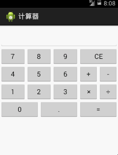 <ScrollView xmlns:android="http://schemas.android.com/apk/res/android"android:layout_width="match_parent"android:layout_height="match_parent"android:orientation="vertical" ><LinearLayoutandroid:layout_width="match_parent"android:layout_height="wrap_content"android:orientation="vertical" ><TextViewandroid:id="@+id/textView1"android:layout_width="match_parent"android:layout_height="wrap_content" /><EditTextandroid:id="@+id/editText1"android:layout_width="match_parent"android:layout_height="wrap_content"android:enabled="false"android:inputType="none"android:textSize="18sp" /><LinearLayoutandroid:baselineAligned="false"android:layout_width="match_parent"android:layout_height="match_parent" ><TableLayoutandroid:layout_width="0dp"android:layout_height="match_parent"android:layout_weight="2" ><LinearLayoutandroid:layout_width="match_parent"android:layout_height="wrap_content" ><Buttonandroid:id="@+id/bt_7" android:layout_width="0dp"android:layout_height="wrap_content"android:layout_weight="1"android:text="@string/bt_7" /><Buttonandroid:id="@+id/bt_8" android:layout_width="0dp"android:layout_height="wrap_content"android:layout_weight="1"android:text="@string/bt_8" /><Buttonandroid:id="@+id/bt_9" android:layout_width="0dp"android:layout_height="wrap_content"android:layout_weight="1"android:text="@string/bt_9" /></LinearLayout><LinearLayoutandroid:layout_width="match_parent"android:layout_height="wrap_content" ><Buttonandroid:id="@+id/bt_4" android:layout_width="0dp"android:layout_height="wrap_content"android:layout_weight="1"android:text="@string/bt_4" /><Buttonandroid:id="@+id/bt_5" android:layout_width="0dp"android:layout_height="wrap_content"android:layout_weight="1"android:text="@string/bt_5" /><Buttonandroid:id="@+id/bt_6"android:layout_width="0dp"android:layout_height="wrap_content"android:layout_weight="1"android:text="@string/bt_6" /></LinearLayout><LinearLayoutandroid:layout_width="match_parent"android:layout_height="wrap_content" ><Buttonandroid:id="@+id/bt_1"android:layout_width="0dp"android:layout_height="wrap_content"android:layout_weight="1"android:text="@string/bt_1" /><Buttonandroid:id="@+id/bt_2"android:layout_width="0dp"android:layout_height="wrap_content"android:layout_weight="1"android:text="@string/bt_2" /><Buttonandroid:id="@+id/bt_3"android:layout_width="0dp"android:layout_height="wrap_content"android:layout_weight="1"android:text="@string/bt_3" /></LinearLayout><LinearLayoutandroid:layout_width="match_parent"android:layout_height="wrap_content" ><Buttonandroid:id="@+id/bt_0"android:layout_width="0dp"android:layout_height="wrap_content"android:layout_weight="1"android:text="@string/bt_0" /><Buttonandroid:id="@+id/bt_point"android:layout_width="0dp"android:layout_height="wrap_content"android:layout_weight="1"android:text="@string/bt_point" /></LinearLayout></TableLayout><TableLayoutandroid:layout_width="0dp"android:layout_height="match_parent"android:layout_weight="1" ><Buttonandroid:id="@+id/bt_ce"android:layout_width="match_parent"android:layout_height="wrap_content"android:text="@string/bt_ce" /><LinearLayoutandroid:layout_width="match_parent"android:layout_height="wrap_content" ><Buttonandroid:id="@+id/bt_plus"android:layout_width="0dp"android:layout_height="wrap_content"android:layout_weight="1"android:text="@string/bt_plus" /><Buttonandroid:id="@+id/bt_minus"android:layout_width="0dp"android:layout_height="wrap_content"android:layout_weight="1"android:text="@string/bt_minus" /></LinearLayout><LinearLayoutandroid:layout_width="match_parent"android:layout_height="wrap_content" ><Buttonandroid:id="@+id/bt_multi"android:layout_width="0dp"android:layout_height="wrap_content"android:layout_weight="1"android:text="@string/bt_multi" /><Buttonandroid:id="@+id/bt_div"android:layout_width="0dp"android:layout_height="wrap_content"android:layout_weight="1"android:text="@string/bt_div" /></LinearLayout><Buttonandroid:id="@+id/bt_result"android:layout_width="match_parent"android:layout_height="wrap_content"android:text="@string/bt_result" /></TableLayout></LinearLayout></LinearLayout></ScrollView>之后是MainActivity.java没什么好说的,基本与直接Win窗体的《C#计算器编写代码》,将C#改成java是一个很简单的事情。唯一注意的是,这里的按钮比较多,因此不建议像《【Android】利用Java代码布局,按钮添加点击事件》(点击打开链接)一样,使用内部匿名类实现按钮的点击事件,应该让MainActivity实现OnClickListener接口,之后在继承下来的onClick方法,根据传递过来的View v中的id,利用switch-case结构来搞,这样清晰明了。