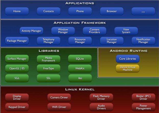 第二层:Android Runtime层,也就是安卓运行时层,其实就是一个Java虚拟机——Dalvik虚拟机和一个核心类库。这部分和普通的Java虚拟机在使用方面都是一样的,所以这一层虽然在开发中会接触到,但只要学过Java的,应该都懂。
