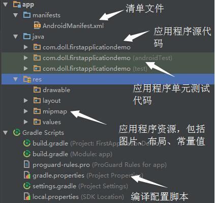 <?xml version="1.0" encoding="utf-8"?><manifest xmlns:android="http://schemas.android.com/apk/res/android" package="com.doll.firstapplicationdemo" > <applicationandroid:allowBackup="true"android:icon="@mipmap/ic_launcher"android:label="@string/app_name"android:supportsRtl="true"android:theme="@style/AppTheme" ><activity android:name=".MainActivity" > <intent-filter><action android:name="android.intent.action.MAIN" /><category android:name="android.intent.category.LAUNCHER" /> </intent-filter></activity> </application></manifest>简单解释一下:首先manifest根节点,定义了命名空间和包名;接下来是application结点,代表一个应用程序,其中配置应用程序的标签、名称、主题等等;在application结点里面定义了主Activity(有点类似于Web开发中的首页),属性中定义了类名以及意图过滤器(这里就不详细展开了,在后面详细讲解activity时会介绍)。这样,运行程序时,Android框架就可以帮我们建立必要的对象实例,让我们的应用程序运行起来了。其实,博主觉得这个配置文件和Spring框架中的ApplicationContext.xml配置文件的功能很类似。当然,这个配置文件不是一成不变的,和SSH框架的配置文件一样,随着项目的不断完善,我们会向其中写入各种配置信息。