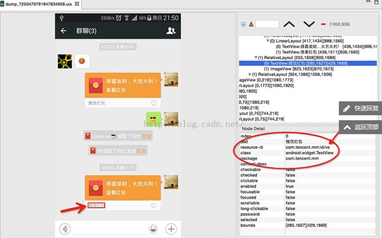 //将微信的通知栏消息打开Notification notification = (Notification) event.getParcelableData();PendingIntent pendingIntent = notification.contentIntent;try {pendingIntent.send();} catch (PendingIntent.CanceledException e) {e.printStackTrace();}具体代码网上有很多,一般都是通过:findAccessibilityNodeInfosByText、findAccessibilityNodeInfosByViewId查找文本或者资源节点进行点击操作,但新版微信开红包页面进行了处理,没有文本信息,而如果采用: