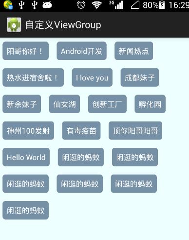 /** * 流式标签(动态的,根据传入的数据动态添加标签) */public class DynamicTagFlowLayout extends ViewGroup {private List<String> mTags = new ArrayList<String>();public DynamicTagFlowLayout(Context context, AttributeSet attrs, int defStyle) { super(context, attrs, defStyle); } public DynamicTagFlowLayout(Context context, AttributeSet attrs) { super(context, attrs); } public DynamicTagFlowLayout(Context context) { super(context); }@Override protected void onMeasure(int widthMeasureSpec, int heightMeasureSpec) { int widthMode = MeasureSpec.getMode(widthMeasureSpec); int widthSize = MeasureSpec.getSize(widthMeasureSpec); int heightMode = MeasureSpec.getMode(heightMeasureSpec); int heightSize = MeasureSpec.getSize(heightMeasureSpec);//当前ViewGroup的总高度 int totalHeight= 0; //所有行中的最大宽度 int maxLineWidth = 0;//当前行的最大高度 int lineMaxHeight = 0; //当前行的总宽度 int currentLineWidth = 0;//每个childView所占用的宽度 int childViewWidthSpace = 0; //每个childView所占用的高度 int childViewHeightSpace = 0;int count = getChildCount(); MarginLayoutParams layoutParams;for(int i = 0; i < count; i++){View child = getChildAt(i);if(child.getVisibility() != View.GONE){//只有当这个View能够显示的时候才去测量//测量每个子View,以获取子View的宽和高measureChild(child, widthMeasureSpec, heightMeasureSpec);layoutParams = (MarginLayoutParams) child.getLayoutParams();childViewWidthSpace = child.getMeasuredWidth() + layoutParams.leftMargin + layoutParams.rightMargin;childViewHeightSpace = child.getMeasuredHeight() + layoutParams.topMargin + layoutParams.bottomMargin;if(currentLineWidth + childViewWidthSpace > widthSize){//表示如果当前行再加上现在这个子View,就会超出总的规定宽度,需要另起一行 totalHeight += lineMaxHeight; if(maxLineWidth < currentLineWidth){//如果行的最长宽度发生了变化,更新保存的最长宽度 maxLineWidth = currentLineWidth; } currentLineWidth = childViewWidthSpace;//另起一行后,需要重置当前行宽 lineMaxHeight = childViewHeightSpace;}else{//表示当前行可以继续添加子元素 currentLineWidth += childViewWidthSpace; if(lineMaxHeight < childViewHeightSpace){ lineMaxHeight = childViewHeightSpace; }}} }setMeasuredDimension(widthMode == MeasureSpec.EXACTLY ? widthSize : maxLineWidth, heightMode == MeasureSpec.EXACTLY ? heightSize : totalHeight);} @Override protected void onLayout(boolean changed, int l, int t, int r, int b) { //当前是第几行 int currentLine = 1; //存放每一行的最大高度 List<Integer> lineMaxHeightList = new ArrayList<Integer>();//每个childView所占用的宽度 int childViewWidthSpace = 0; //每个childView所占用的高度 int childViewHeightSpace = 0;//当前行的最大高度 int lineMaxHeight = 0; //当前行的总宽度 int currentLineWidth = 0;int count = getChildCount(); MarginLayoutParams layoutParams;for(int i = 0; i < count; i++){int cl= 0, ct = 0, cr = 0, cb = 0;View child = getChildAt(i);if(child.getVisibility() != View.GONE){//只有当这个View能够显示的时候才去测量layoutParams = (MarginLayoutParams) child.getLayoutParams();childViewWidthSpace = child.getMeasuredWidth() + layoutParams.leftMargin + layoutParams.rightMargin;childViewHeightSpace = child.getMeasuredHeight() + layoutParams.topMargin + layoutParams.bottomMargin;System.out.println("getWidth()---->"+getWidth());if(currentLineWidth + childViewWidthSpace > getWidth()){//表示如果当前行再加上现在这个子View,就会超出总的规定宽度,需要另起一行 lineMaxHeightList.add(lineMaxHeight);//此时先将这一行的最大高度加入到集合中 //新的一行,重置一些参数 currentLine++; currentLineWidth = childViewWidthSpace; lineMaxHeight = childViewHeightSpace;cl = layoutParams.leftMargin; if(currentLine > 1){ for(int j = 0; j < currentLine - 1; j++){ct += lineMaxHeightList.get(j); } ct += layoutParams.topMargin ; }else{ ct = layoutParams.topMargin; }}else{//表示当前行可以继续添加子元素 cl = currentLineWidth + layoutParams.leftMargin; if(currentLine > 1){ for(int j = 0; j < currentLine - 1; j++){ct += lineMaxHeightList.get(j); } ct += layoutParams.topMargin; }else{ ct = layoutParams.topMargin; } currentLineWidth += childViewWidthSpace; if(lineMaxHeight < childViewHeightSpace){ lineMaxHeight = childViewHeightSpace; }}cr = cl + child.getMeasuredWidth();cb = ct + child.getMeasuredHeight();child.layout(cl, ct, cr, cb);} } }@Override public LayoutParams generateLayoutParams(AttributeSet attrs) { return new MarginLayoutParams(getContext(), attrs); }public void setTags(List<String> tags){ if(tags!= null){mTags.clear();mTags.addAll(tags);for(int i = 0; i < mTags.size(); i++){TextView tv = new TextView(getContext());MarginLayoutParams lp = new MarginLayoutParams(MarginLayoutParams.WRAP_CONTENT, MarginLayoutParams.WRAP_CONTENT);lp.setMargins(15, 15, 15, 15);//lp.width = MarginLayoutParams.WRAP_CONTENT;//lp.height = MarginLayoutParams.WRAP_CONTENT;tv.setLayoutParams(lp);tv.setBackgroundResource(R.drawable.tv_bg);/* * setPadding一定要在setBackgroundResource后面使用才有效!!! * http://stackoverflow.com/questions/18327498/setting-padding-for-textview-not-working */tv.setPadding(15, 15, 15, 15);tv.setTextColor(Color.WHITE);tv.setText(mTags.get(i));tv.setOnClickListener(new OnClickListener() { @Override public void onClick(View v) { if(listener != null){listener.onClick(v); } }});addView(tv);}requestLayout(); } }private OnTagItemClickListener listener; public interface OnTagItemClickListener{ public void onClick(View v); } public void setOnTagItemClickListener(OnTagItemClickListener l){ listener = l; }}MainActivity:public class MainActivity extends Activity {private DynamicTagFlowLayout dynamicTagFlowLayout;List<String> tags = new ArrayList<String>(); @Override protected void onCreate(Bundle savedInstanceState) { super.onCreate(savedInstanceState); setContentView(R.layout.activity_dynamic_tagflo