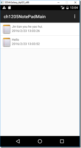 using System;namespace MyDemos.SrcDemos{class ch1205Note : Java.Lang.Object{public long Id { get; set; }public string Body { get; set; }public DateTime ModifiedTime { get; set; }public ch1205Note(){Id = -1L;Body = string.Empty;}public ch1205Note(long id, string body, DateTime modified){Id = id;Body = body;ModifiedTime = modified;}public override string ToString(){return ModifiedTime.ToString();}}} (6)添加ch1205LinedEditText.cs文件 using Android.Content;using Android.Runtime;using Android.Widget;using Android.Graphics;using Android.Util;namespace MyDemos.SrcDemos{[Register("MyDemos.SrcDemos.ch1205LinedEditText")]class ch1205LinedEditText : EditText{private Rect rect;private Paint paint;// 为了LayoutInflater需要提供此构造函数public ch1205LinedEditText(Context context, IAttributeSet attrs): base(context, attrs){rect = new Rect();paint = new Paint();paint.SetStyle(Android.Graphics.Paint.Style.Stroke);paint.Color = Color.LightGray;}protected override void OnDraw(Canvas canvas){int count = LineCount;for (int i = 0; i < count; i++){int baseline = GetLineBounds(i, rect);canvas.DrawLine(rect.Left, baseline + 1, rect.Right, baseline + 1, paint);}base.OnDraw(canvas);}}}(7)添加ch1205NoteRepository.cs文件 using System;using System.Collections.Generic;using Mono.Data.Sqlite;namespace MyDemos.SrcDemos{class ch1205NoteRepository{private static string db_file = "notes.db3";private static SqliteConnection GetConnection(){var dbPath = System.IO.Path.Combine(System.Environment.GetFolderPath(System.Environment.SpecialFolder.Personal), db_file);bool exists = System.IO.File.Exists(dbPath);if (!exists) SqliteConnection.CreateFile(dbPath);var conn = new SqliteConnection("Data Source=" + dbPath);if (!exists) CreateDatabase(conn);return conn;}private static void CreateDatabase(SqliteConnection connection){var sql = "CREATE TABLE ITEMS (Id INTEGER PRIMARY KEY AUTOINCREMENT, Body ntext, Modified datetime);";connection.Open();using (var cmd = connection.CreateCommand()){cmd.CommandText = sql;cmd.ExecuteNonQuery();}// Create a sample note to get the user startedsql = "INSERT INTO ITEMS (Body, Modified) VALUES (@Body, @Modified);";using (var cmd = connection.CreateCommand()){cmd.CommandText = sql;cmd.Parameters.AddWithValue("@Body", "今天有个约会");cmd.Parameters.AddWithValue("@Modified", DateTime.Now);cmd.ExecuteNonQuery();}connection.Close();}public static IEnumerable<ch1205Note> GetAllNotes(){var sql = "SELECT * FROM ITEMS;";using (var conn = GetConnection()){conn.Open();using (var cmd = conn.CreateCommand()){cmd.CommandText = sql;using (var reader = cmd.ExecuteReader()){while (reader.Read()){yield return new ch1205Note(reader.GetInt32(0),reader.GetString(1),reader.GetDateTime(2));}}}}}public static ch1205Note GetNote(long id){var sql = "SELECT * FROM ITEMS WHERE Id = id;";using (var conn = GetConnection()){conn.Open();using (var cmd = conn.CreateCommand()){cmd.CommandText = sql;using (var reader = cmd.ExecuteReader()){if (reader.Read())return new ch1205Note(reader.GetInt32(0), reader.GetString(1), reader.GetDateTime(2));elsereturn null;}}}}public static void DeleteNote(ch1205Note note){var sql = string.Format("DELETE FROM ITEMS WHERE Id = {0};", note.Id);using (var conn = GetConnection()){conn.Open();using (var cmd = conn.CreateCommand()){cmd.CommandText = sql;cmd.ExecuteNonQuery();}}}public static void SaveNote(ch1205Note note){using (var conn = GetConnection()){conn.Open();using (var cmd = conn.CreateCommand()){if (note.Id < 0){// Do an insertcmd.CommandText = "INSERT INTO ITEMS (Body, Modified) VALUES (@Body, @Modified); SELECT last_insert_rowid();";cmd.Parameters.AddWithValue("@Body", note.Body);cmd.Parameters.AddWithValue("@Modified", DateTime.Now);note.Id = (long)cmd.ExecuteScalar();}else{// Do an updatecmd.CommandText = "UPDATE ITEMS SET Body = @Body, Modified = @Modified WHERE Id = @Id";cmd.Parameters.AddWithValue("@Id", note.Id);cmd.Parameters.AddWithValue("@Body", note.Body);cmd.Parameters.AddWithValue("@Modified", DateTime.Now);cmd.ExecuteNonQuery();}}}}}} (8)添加ch1205NoteAdapter.cs文件 using Android.App;using Android.Content;using Android.Widget;namespace MyDemos.SrcDemos{class ch1205NoteAdapter : ArrayAdapter{private Activity activity;public ch1205NoteAdapter(Activity activity, Context context, int textViewResourceId, ch1205Note[] objects): base(context, textViewResourceId, objects){this.activity = activity;}public override Android.Views.View GetView(int position, Android.Views.View convertView, Android.Views.ViewGroup parent){//Get our object for this positionvar item = (ch1205Note)GetItem(position);// 如果convertView不为null则重用它,否则从当前布局中填充(inflate)它。// 由于这种方式不是每次都填充一个新的view,因此可提高性能。var view = (convertView ?? activity.LayoutInflater.Inflate(Resource.Layout.ch1205_Main, parent, false)) as LinearLayout;view.FindViewById<TextView>(Resource.Id.body).Text = Left(item.Body.Replace("