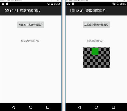 using Android.App;using Android.Content;using Android.OS;using Android.Runtime;using Android.Widget;namespace MyDemos.SrcDemos{[Activity(Label = "【例12-3】读取图库图片")]public class ch1203ReadGallery : Activity{protected override void OnCreate(Bundle savedInstanceState){base.OnCreate(savedInstanceState);SetContentView(Resource.Layout.ch1203_ReadGallery);var btn1 = FindViewById<Button>(Resource.Id.btn1);btn1.Click += delegate {var imageIntent = new Intent();imageIntent.SetType("image/*");imageIntent.SetAction(Intent.ActionGetContent);StartActivityForResult( Intent.CreateChooser(imageIntent, "选择的图片:"), 0);};}protected override void OnActivityResult(int requestCode, [GeneratedEnum] Result resultCode, Intent data){base.OnActivityResult(requestCode, resultCode, data);if (resultCode == Result.Ok){var imageView = FindViewById<ImageView>(Resource.Id.myImageView);imageView.SetImageURI(data.Data);}}}}以上就是本文的全部内容,希望对大家的学习有所帮助,也希望大家多多支持脚本之家。