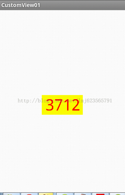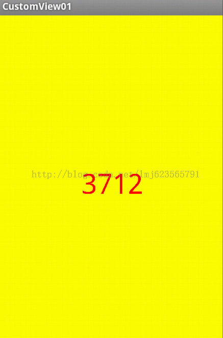 @Override protected void onMeasure(int widthMeasureSpec, int heightMeasureSpec) {int widthMode = MeasureSpec.getMode(widthMeasureSpec);int widthSize = MeasureSpec.getSize(widthMeasureSpec);int heightMode = MeasureSpec.getMode(heightMeasureSpec);int heightSize = MeasureSpec.getSize(heightMeasureSpec);int width;int height ;if (widthMode == MeasureSpec.EXACTLY){ width = widthSize;} else{ mPaint.setTextSize(mTitleTextSize); mPaint.getTextBounds(mTitle, 0, mTitle.length(), mBounds); float textWidth = mBounds.width(); int desired = (int) (getPaddingLeft() + textWidth + getPaddingRight()); width = desired;} if (heightMode == MeasureSpec.EXACTLY){ height = heightSize;} else{ mPaint.setTextSize(mTitleTextSize); mPaint.getTextBounds(mTitle, 0, mTitle.length(), mBounds); float textHeight = mBounds.height(); int desired = (int) (getPaddingTop() + textHeight + getPaddingBottom()); height = desired;} setMeasuredDimension(width, height); } 现在我们修改下布局文件:<RelativeLayout xmlns:android="http://schemas.android.com/apk/res/android"xmlns:tools="http://schemas.android.com/tools"xmlns:custom="http://schemas.android.com/apk/res/com.example.customview01"android:layout_width="match_parent"android:layout_height="match_parent" > <com.example.customview01.view.CustomTitleView android:layout_width="wrap_content" android:layout_height="wrap_content" custom:titleText="3712" android:padding="10dp" custom:titleTextColor="#ff0000" android:layout_centerInParent="true" custom:titleTextSize="40sp" /></RelativeLayout>现在的效果是: