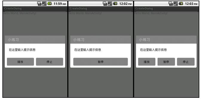 public class GlobleDialog extends Dialog implements View.OnClickListener {private TextView titleTextView, contentTextView; private Button leftButton, centerButton ,rightButton; private DialogBean bean;public GlobleDialog(Context context, int theme, DialogBean bean) { super(context, theme); this.bean = bean; initWedgits(); }/*** 初始化各组件*/ private void initWedgits() { try { setCancelable(bean.isCancelable()); setCanceledOnTouchOutside(bean.isOutCancelable()); View dialogView = getLayoutInflater().inflate(bean.getLayoutResID(), null); titleTextView = (TextView) dialogView.findViewById(R.id.button_title); contentTextView = (TextView) dialogView.findViewById(R.id.button_content); titleTextView.setText(bean.getTitle()); contentTextView.setText(bean.getContent()); leftButton = (Button) dialogView.findViewById(R.id.button_left); centerButton = (Button) dialogView.findViewById(R.id.button_center); rightButton = (Button) dialogView.findViewById(R.id.button_right);leftButton.setOnClickListener(this); centerButton.setOnClickListener(this); rightButton.setOnClickListener(this);if(DialogButtonType.OneButton == bean.getButtonType()) { leftButton.setVisibility(View.GONE); rightButton.setVisibility(View.GONE); } else if(DialogButtonType.TwoButton == bean.getButtonType()) { centerButton.setVisibility(View.GONE); } setContentView(dialogView);Window dialogWindow = getWindow(); WindowManager.LayoutParams lp = dialogWindow.getAttributes(); dialogWindow.setGravity(Gravity.CENTER); DisplayMetrics dm = new DisplayMetrics(); dialogWindow.getWindowManager().getDefaultDisplay().getMetrics(dm); lp.width = dm.widthPixels - 20; dialogWindow.setAttributes(lp); } catch (Exception e) { e.printStackTrace(); } }@Override public void onClick(View v) { try { switch (v.getId()) { case R.id.button_left: bean.getListener().onClick(0); break; case R.id.button_center: bean.getListener().onClick(1); break; case R.id.button_right: bean.getListener().onClick(2); break; default: break; } } catch (Exception e) { e.printStackTrace(); } }} 自定义的GlobleDialog的代码写完了,那就看看是如何使用的吧:package com.llew.e.dialog.view.activity;import android.app.Activity; import android.app.Dialog; import android.os.Bundle; import android.view.View; import android.view.View.OnClickListener; import android.widget.TextView; import android.widget.Toast;import com.llew.e.dialog.R; import com.llew.e.dialog.view.bean.DialogBean; import com.llew.e.dialog.view.bean.DialogBean.DialogButtonType; import com.llew.e.dialog.view.bean.DialogBean.DialogClickListener; import com.llew.e.dialog.view.wedgit.GlobleDialog;public class MainActivity extends Activity { /** Called when the activity is first created. */private Dialog dialog; private TextView textView;@Override public void onCreate(Bundle savedInstanceState) { super.onCreate(savedInstanceState); setContentView(R.layout.main); textView = (TextView) findViewById(R.id.textview); textView.setOnClickListener(new OnClickListener() { @Override public void onClick(View v) { DialogBean dialogBean = new DialogBean(); dialogBean.setCancelable(true); dialogBean.setOutCancelable(true); dialogBean.setTitle("小练习"); dialogBean.setContent("在这里输入提示信息"); dialogBean.setButtonType(DialogButtonType.TwoButton); dialogBean.setLayoutResID(R.layout.dialog_common); dialogBean.setListener(new DialogClickListener() { @Override public void onClick(int buttonIndex) { switch (buttonIndex) { case 0: Toast.makeText(MainActivity.this, "点击了播放", Toast.LENGTH_SHORT).show(); break; case 1: Toast.makeText(MainActivity.this, "点击了暂停", Toast.LENGTH_SHORT).show(); break; case 2: Toast.makeText(MainActivity.this, "点击了停止", Toast.LENGTH_SHORT).show(); break; default: break; } } }); createDialog(dialogBean); } }); }public void createDialog(DialogBean bean) { if(null == dialog) { dialog = new GlobleDialog(MainActivity.this, R.style.theme_dialog_alert, bean); } dialog.show(); } } 代码实在是没有什么好解释的,我相信你一看就会,那看看运行效果吧: