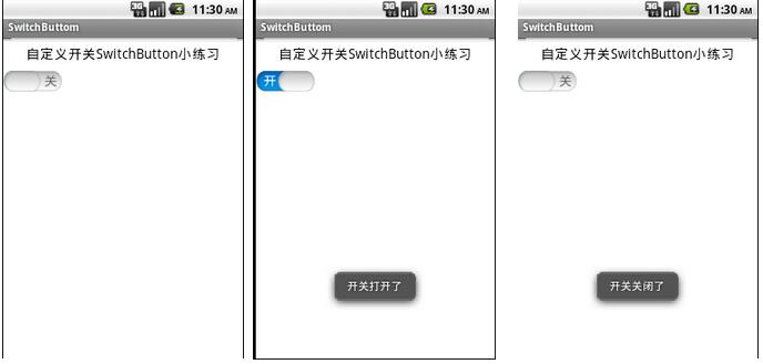 public class SwitchButton extends LinearLayout { /** * 开关图片 */private LinearLayout switchParent;/** * 滑块图片 */private ImageView switchButton;/** * 按钮状态,默认关闭 */private boolean isOn = false;/** * 滑块需要滑动的距离 */private int scrollDistance;/** * 开关按钮监听器 */private SwitchChangedListner listner; public SwitchButton(Context context) { super(context); initWedgits(context);} public SwitchButton(Context context, AttributeSet attrs) { super(context, attrs); initWedgits(context);} /** * 初始化组件 * * @param context * 上下文环境 */private void initWedgits(Context context) { try {View view = LayoutInflater.from(context).inflate(R.layout.switch_button, this);switchParent = (LinearLayout) view.findViewById(R.id.switch_parent);switchButton = (ImageView) view.findViewById(R.id.switch_button);addListeners(); } catch (Exception e) {e.printStackTrace(); }} /** * 添加事件监听器 */private void addListeners() { try {switchParent.setOnClickListener(new OnClickListener() { @Override public void onClick(View v) {isOn = !isOn;scrollSwitch();if (null != listner) { // 开关开发或者关闭的回调方法 listner.switchChanged(getId(), isOn);} }}); } catch (Exception e) {e.printStackTrace(); }} /** * 滑动开关 */private void scrollSwitch() { // 获取滑块需要滑动的距离,滑动距离等于父组建的宽度减去滑块的宽度 scrollDistance = switchParent.getWidth() - switchButton.getWidth(); // 初始化滑动事件 Animation animation = null; if (isOn) {animation = new TranslateAnimation(0, scrollDistance, 0, 0); } else {animation = new TranslateAnimation(scrollDistance, 0, 0, 0); } // 设置滑动时间 animation.setDuration(200); // 滑动之后保持状态 animation.setFillAfter(true); // 开始滑动 switchButton.startAnimation(animation);} /** * 获取开关状态 * * @return 【true:打开】【false:关闭】 */public boolean isOn() { return isOn;} /** * 设置开关状态 * * @param isOn * 开关状态【true:打开】【false:关闭】 */public void setOn(boolean isOn) { if (this.isOn == isOn) {return; } this.isOn = isOn; post(new Runnable() {@Overridepublic void run() { scrollSwitch();} });} /** * 设置开关状态监听器 * * @param listner * 开关状态监听器 */public void setOnSwitchListner(SwitchChangedListner listner) { this.listner = listner;} /** * 开关状态监听器 * * @author llew * */public interface SwitchChangedListner { /*** 开关状态改变** @param viewId* 当前开关ID* @param isOn* 开关是否打开【true:打开】【false:关闭】*/ public void switchChanged(Integer viewId, boolean isOn);} } SwitchButton的实现也很简单,首先是初始化组件initWedgits(),然后添加事件监听器addListeners(),在监听器中做逻辑判断,代码都有注释,就不再详细说明了public class MainActivity extends Activity {private SwitchButton switchButton;/** Called when the activity is first created. */@Overridepublic void onCreate(Bundle savedInstanceState) { super.onCreate(savedInstanceState); setContentView(R.layout.main); initWedgits();} /** * 初始化各组件 */private void initWedgits() { try {switchButton = (SwitchButton) findViewById(R.id.switchButton);// switchButton.setOn(false);switchButton.setOn(true);addListeners(); } catch (Exception e) {e.printStackTrace(); }}/** * 添加事件监听器 */private void addListeners() { try {switchButton.setOnSwitchListner(new SwitchChangedListner() { @Override public void switchChanged(Integer viewId, boolean isOn) {if(isOn) { Toast.makeText(getApplicationContext(), "开关打开了", Toast.LENGTH_LONG).show();} else { Toast.makeText(getApplicationContext(), "开关关闭了", Toast.LENGTH_LONG).show();} }}); } catch (Exception e) {e.printStackTrace(); }} } 好了,代码都贴完了,接下来看看运行效果吧,(*^__^*) 嘻嘻……