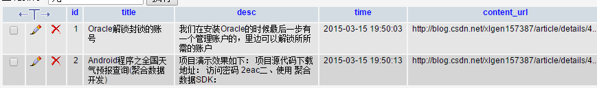 SET SQL_MODE = "NO_AUTO_VALUE_ON_ZERO";SET time_zone = "+00:00";-- Database: `newsdemo`-- 表的结构 `news`CREATE TABLE IF NOT EXISTS `news` ( `id` int(10) NOT NULL AUTO_INCREMENT, `title` text NOT NULL, `desc` text NOT NULL, `time` timestamp NOT NULL DEFAULT CURRENT_TIMESTAMP, `content_url` text NOT NULL, `pic_url` text NOT NULL, PRIMARY KEY (`id`)) ENGINE=InnoDB DEFAULT CHARSET=utf8 AUTO_INCREMENT=3 ;---- 转存表中的数据 `news`--INSERT INTO `news` (`id`, `title`, `desc`, `time`, `content_url`, `pic_url`) VALUES(1, "Oracle解锁封锁的账号", "我们在安装Oracle的时候最后一步有一个管理账户的,里边可以解锁所所需的账户", "2015-03-15 11:50:03", "http://blog.csdn.net/xlgen157387/article/details/41595709", "http://img.blog.csdn.net/20141129144613046?watermark/2/text/aHR0cDovL2Jsb2cuY3Nkbi5uZXQveGxnZW4xNTczODc=/font/5a6L5L2T/fontsize/400/fill/I0JBQkFCMA==/dissolve/70/gravity/Center"),(2, "Android程序之全国天气预报查询(聚合数据开发)", "项目演示效果如下: 项目源代码下载地址: 访问密码 2eac二、使用 聚合数据SDK:", "2015-03-15 11:50:13", "http://blog.csdn.net/xlgen157387/article/details/44246119", "http://img.blog.csdn.net/20150314095028546");执行结果如下:(由于这是使用的appserv,所以在phpMyAdmin中看到的这种效果1)