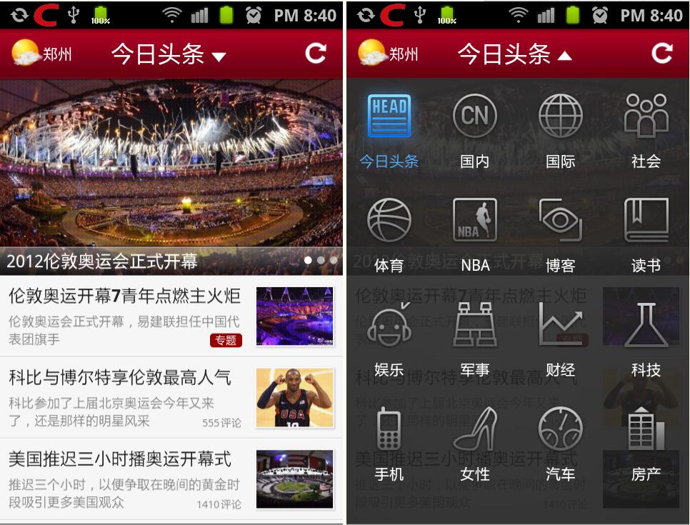 /** * 初始化数据,将数据加载到对应的View中 */ private void initData(){ PulldownMenuItem item = new PulldownMenuItem(context); item.setMenuAlign(menuAlign); item.setMenuTextColor(menuTextColor); item.setMenuTextSize(menuTextSize); int txtLength = menuTexts.length; int imgLength = menuImageRes.length;if (txtLength != 0 && imgLength != 0){for (int i = 0; i < imgLength; i++){PulldownMenuItem menuItem = new PulldownMenuItem(context, item);if(!currentItem.equals(menuTexts[i])){ menuItem.setImageRes(menuImageRes[i]); menuItem.setMenuText(menuTexts[i]);}else{ menuItem.setMenuText(menuTexts[i]); menuItem.setMenuTextColor(Color.parseColor("#4FA7F9")); menuItem.setImageRes(ConstantCategoryMenu.newsImageResPress[i]);}menuMenuItems.add(menuItem);} } else{if (txtLength != 0){for (int i = 0; i < txtLength; i++){ PulldownMenuItem menuItem = new PulldownMenuItem(context, item);if(!currentItem.equals(menuTexts[i])){ menuItem.setMenuText(menuTexts[i]); }else{ menuItem.setMenuText(menuTexts[i]); menuItem.setMenuTextColor(Color.parseColor("#4FA7F9")); }menuMenuItems.add(menuItem);}}else if (imgLength != 0){for (int i = 0; i < imgLength; i++){ PulldownMenuItem menuItem = new PulldownMenuItem(context, item); menuItem.setImageRes(menuImageRes[i]); menuMenuItems.add(menuItem);}} } }currentItem代表当前的选择项,在初始化数据过程中,需要检测哪项菜单被选中了,如果某项菜单被选中,则在展开时需要将该项菜单图片和文字颜色设置成相应状态,表示该项菜单被选中。在初始化过程中分为三种情况:第一种是菜单项既有图片也有文字;第二种是菜单项只有文字;第三种是菜单项只有图片;所以在上面代码中需要进行相应判断。上面是初始化菜单中的数据,下面是初始化菜单中的内容: /** * 初始化菜单内容 * @param context * @param columns 菜单的列数 * @return */ private GridView getMenuGirdView(Context context, int columns){ if (menuMenuItems.isEmpty()){// 初始化菜单数据initData(); }if (null != menuGridView){return menuGridView; }GridView gridView = new GridView(context); gridView.setLayoutParams(new LinearLayout.LayoutParams(ViewGroup.LayoutParams.MATCH_PARENT, ViewGroup.LayoutParams.MATCH_PARENT)); // 设置数据适配器 gridView.setAdapter(new PulldownMenuAdapter(menuMenuItems)); gridView.setVerticalSpacing(1); gridView.setNumColumns(columns); gridView.setGravity(Gravity.CENTER); gridView.setVerticalScrollBarEnabled(false);if (menuBackground != 0){gridView.setBackgroundResource(menuBackground); }if (menuSelector != -1){gridView.setSelector(menuSelector); }gridView.setHorizontalScrollBarEnabled(false); setMenuListener(gridView);return gridView; }初始化菜单之后,就需要我们菜单中相应的数据,设置数据比较容易,只需要三个数组即可:第一个数组代表菜单项文字内容;第二个数组代表菜单项图片资源,第三个数组代表菜单项被选中的图片资源。如下代码: /** * 新闻菜单项图片资源 */ public final static int[] newsImageRes = { R.drawable.ic_menu_toutiao,R.drawable.ic_menu_gn, R.drawable.ic_menu_gj,R.drawable.ic_menu_sh, R.drawable.ic_menu_sport,R.drawable.ic_menu_nba, R.drawable.ic_menu_blog,R.drawable.ic_menu_book, R.drawable.ic_menu_yule,R.drawable.ic_menu_mil, R.drawable.ic_menu_cj,R.drawable.ic_menu_tech, R.drawable.ic_menu_mobile,R.drawable.ic_menu_women, R.drawable.ic_menu_car,R.drawable.ic_menu_house };/** * 新闻菜单项选中图片资源 */ public final static int[] newsImageResPress = { R.drawable.ic_menu_toutiao_press,R.drawable.ic_menu_gn_press, R.drawable.ic_menu_gj_press,R.drawable.ic_menu_sh_press, R.drawable.ic_menu_sport_press,R.drawable.ic_menu_nba_press, R.drawable.ic_menu_blog_press,R.drawable.ic_menu_book_press, R.drawable.ic_menu_yule_press,R.drawable.ic_menu_mil_press, R.drawable.ic_menu_cj_press,R.drawable.ic_menu_tech_press, R.drawable.ic_menu_mobile_press,R.drawable.ic_menu_women_press, R.drawable.ic_menu_car_press,R.drawable.ic_menu_house_press };/** * 新闻菜单项文字 */ public final static String[] newsMenuTexts = { "今日头条","国内","国际","社会","体育","NBA","博客","读书", "娱乐","军事","财经","科技","手机","女性","汽车","房产" };菜单项使用GridView实现,我们还需要设置每个菜单项的监听事件,在选中一项菜单后或是点击返回键或点击菜单键时实现隐藏,代码如下: /** * 设置菜单项监听事件 * @param gridView */ private void setMenuListener(GridView gridView){ if (null == gridView.getOnItemClickListener()){gridView.setOnItemClickListener(new OnItemClickListener(){@Overridepublic void onItemClick( AdapterView<?> parent,View view, int position,long id){ if (null != menuItemListener){ menuItemListener.onMenuItemClick(parent, view, position); }hide();}}); }// 按返回键或菜单键隐藏菜单 gridView.setOnKeyListener(new OnKeyListener(){@Overridepublic boolean onKey(View v, int keyCode, KeyEvent event){if (event.getAction() == KeyEvent.ACTION_DOWN){ switch (keyCode){ case KeyEvent.KEYCODE_BACK: case KeyEvent.KEYCODE_MENU: hide(); break; }}return false;} }); }在PulldownMenuView类中的show()和hide()方法中,主要是实现菜单的显示与隐藏。在show()方法中,要计算每行存放的菜单数、设置相应的高度、菜单整体的背景、动画效果、菜单显示的位置等效果。具体不再详述。package com.navigation.utility;import com.navigation.acitvity.R;import com.navigation.control.PulldownMenuView;import android.content.Context;import android.view.View;/** * PulldownMenuView基本操作类 * @Description: PulldownMenuView基本操作类 * @File: PulldownMenuUtility.java * @Package com.navigation.utility * @Author Hanyonglu * @Date 2012-7-30 上午11:41:04 * @Version V1.0 */public class MenuUtility { private Context context = null; // PulldownMenuView对象 private PulldownMenuView menu = null; // 图片资源 private int[] imageRes = null; // 文字内容 private 