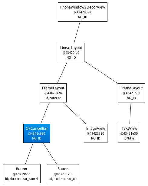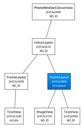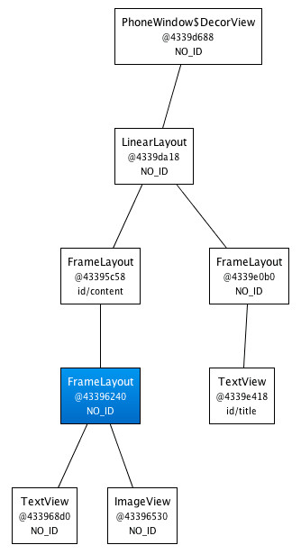 当你使用HierarchyViewer工具来检查时,你会发现事情变得很有趣。如果你仔细查看View树,你将会注意到,我们在XML文件中定义的FrameLayout(蓝色高亮显示)是另一个FrameLayout唯一的子元素: