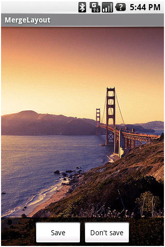 很显然,在这个场合使用<merge />是因为Activity的ContentView的父元素始终是FrameLayout。如果你的布局使用LinearLayout作为它的根标签(举例),那么你就不能使用这个技巧。<merge />在其它的一些场合也很有用的。例如,它与<include />标签结合起来就能表现得很完美。你还可以在创建一个自定义的组合View时使用<merge />。让我们看一个使用<merge />创建一个新View的例子——OkCancelBar,包含两个按钮,并可以设置按钮标签。下面的XML用于在一个图片上显示自定义的View:
