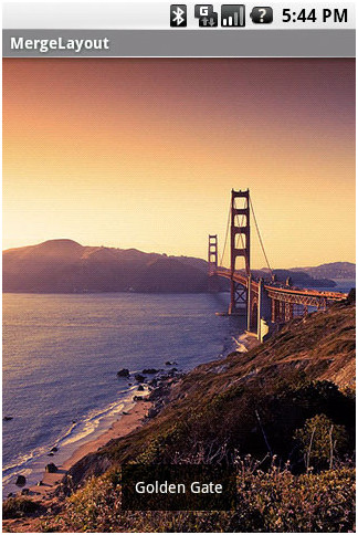 <merge xmlns:android="http://schemas.android.com/apk/res/android"><ImageView android:layout_width="fill_parent" android:layout_height="fill_parent" android:scaleType="center"android:src="@drawable/golden_gate" /><TextViewandroid:layout_width="wrap_content" android:layout_height="wrap_content" android:layout_marginBottom="20dip"android:layout_gravity="center_horizontal|bottom"android:padding="12dip"android:background="#AA000000"android:textColor="#ffffffff"android:text="Golden Gate" /></merge>