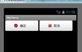 public class IdentifyButtonActivity extendsActivity { privateImageBtn imageBtn1;privateImageBtn imageBtn2; @Override protectedvoidonCreate(Bundle savedInstanceState) { // TODO Auto-generated method stub super.onCreate(savedInstanceState); setContentView(R.layout.identifybutton);imageBtn1=(ImageBtn)this.findViewById(R.id.btn_right); imageBtn2=(ImageBtn)this.findViewById(R.id.btn_error); imageBtn1.setTextViewText("确定"); imageBtn2.setTextViewText("取消"); imageBtn1.setImageResource(R.drawable.right_icon); imageBtn2.setImageResource(R.drawable.error_icon);imageBtn1.setOnClickListener(newView.OnClickListener() {publicvoidonClick(View v) { // TODO Auto-generated method stub Toast.makeText(getApplicationContext(),"点击的正确按钮",1).show(); } });imageBtn2.setOnClickListener(newView.OnClickListener() {publicvoidonClick(View v) { // TODO Auto-generated method stub Toast.makeText(getApplicationContext(),"点击的错误按钮",1).show(); } }); } }最后看看我们自定义控件的效果吧!