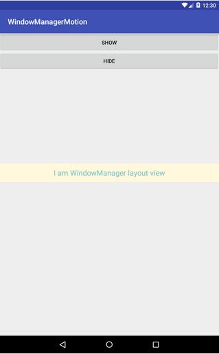 package com.gearmotion.app.windowmanagermotion;import android.content.Context;import android.graphics.PixelFormat;import android.graphics.Rect;import android.support.v7.app.AppCompatActivity;import android.os.Bundle;import android.view.Gravity;import android.view.LayoutInflater;import android.view.MotionEvent;import android.view.View;import android.view.ViewGroup;import android.view.WindowManager;import android.widget.Button;public class MainActivity extends AppCompatActivity implements View.OnClickListener, View.OnTouchListener { Button mShowBtn; Button mHideBtn; WindowManager mWm; LayoutInflater mLayoutInflater; View mWindowView; @Override protected void onCreate(Bundle savedInstanceState) {super.onCreate(savedInstanceState);setContentView(R.layout.activity_main);mShowBtn = (Button) this.findViewById(R.id.showbtn);mHideBtn = (Button) this.findViewById(R.id.hidebtn);mShowBtn.setOnClickListener(this);mHideBtn.setOnClickListener(this);init(); } private void init() {mWm = (WindowManager) this.getApplicationContext().getSystemService(Context.WINDOW_SERVICE);mLayoutInflater = LayoutInflater.from(this); } @Override public void onClick(View v) {if (mShowBtn.hashCode() == v.hashCode()) { //显示WindowManager show();}if (mHideBtn.hashCode() == v.hashCode()) { //隐藏windowmanager hide();} } private void show() {mWindowView = mLayoutInflater.inflate(R.layout.item_layout, null);View popView = mWindowView.findViewById(R.id.root);//设置popView的触摸事件,以便点击空白区域的时候使悬浮view消失popView.setOnTouchListener(this);WindowManager.LayoutParams lp = new WindowManager.LayoutParams();//窗口类型同系统弹出框lp.type = WindowManager.LayoutParams.TYPE_SYSTEM_ALERT;//响应输入法//lp.flags = WindowManager.LayoutParams.FLAG_ALT_FOCUSABLE_IM;//透明层lp.format = PixelFormat.TRANSPARENT;lp.width = WindowManager.LayoutParams.MATCH_PARENT;lp.height = WindowManager.LayoutParams.MATCH_PARENT;lp.gravity = Gravity.CENTER_VERTICAL;mWm.addView(mWindowView, lp); } private void hide() {if (mWindowView != null && mWindowView.getParent() != null) { mWm.removeView(mWindowView);} } @Override public boolean onTouch(View v, MotionEvent event) {int x = (int) event.getX();int y = (int) event.getY();//获取主view的可视区域Rect globalRect = new Rect();//获取悬浮view的可视区域Rect tmpRect = new Rect();v.getGlobalVisibleRect(globalRect);View child = ((ViewGroup) v).getChildAt(0);child.getHitRect(tmpRect);if (!tmpRect.contains(x, y) && globalRect.contains(x, y)) { hide();}return true; }}activity_main.xml:<?xml version="1.0" encoding="utf-8"?><LinearLayout xmlns:android="http://schemas.android.com/apk/res/android" xmlns:tools="http://schemas.android.com/tools" android:layout_width="match_parent" android:layout_height="match_parent" android:orientation="vertical" tools:context=".MainActivity"> <Buttonandroid:id="@+id/showbtn"android:layout_width="match_parent"android:layout_height="50dp"android:gravity="center"android:text="show" /> <Buttonandroid:id="@+id/hidebtn"android:layout_width="match_parent"android:layout_height="50dp"android:gravity="center"android:text="hide" /></LinearLayout>item_layout.xml:
