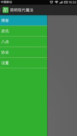看了很多应用,觉得这种侧滑的抽屉效果的菜单很好。不用切换到另一个页面,也不用去按菜单的硬件按钮,直接在界面上一个按钮点击,菜单就滑出来,而且感觉能放很多东西。