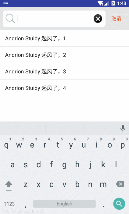 package com.bzu.gxs.search.activity;import android.app.Activity;import android.os.Bundle;import android.support.v7.widget.Toolbar;import android.view.View;import android.widget.AdapterView;import android.widget.ArrayAdapter;import android.widget.ListView;import android.widget.Toast;import com.bzu.gxs.search.R;import com.bzu.gxs.search.adapter.SearchAdapter;import com.bzu.gxs.search.bean.SearchBean;import com.bzu.gxs.search.widget.SearchView;import java.util.ArrayList;import java.util.List;/** * 搜索 * Created by Gxs on 2016/5/6. */public class SearchActivity extends Activity implements SearchView.SearchViewListener{ /*** 搜索结果列表view*/ private ListView lvResults; /*** 搜索view*/ private SearchView searchView; /*** 热搜框列表adapter*/ private ArrayAdapter<String> hintAdapter; /*** 自动补全列表adapter*/ private ArrayAdapter<String> autoCompleteAdapter; /*** 搜索结果列表adapter*/ private SearchAdapter resultAdapter; private List<SearchBean> dbData; /*** 热搜版数据*/ private List<String> hintData; /*** 搜索过程中自动补全数据*/ private List<String> autoCompleteData; /*** 搜索结果的数据*/ private List<SearchBean> resultData; /*** 默认提示框显示项的个数*/ private static int DEFAULT_HINT_SIZE = 4; /*** 提示框显示项的个数*/ private static int hintSize = DEFAULT_HINT_SIZE; /*** 设置提示框显示项的个数** @param hintSize 提示框显示个数*/ public static void setHintSize(int hintSize) {SearchActivity.hintSize = hintSize; } @Override protected void onCreate(Bundle savedInstanceState) {super.onCreate(savedInstanceState);setContentView(R.layout.activity_main);initData();initViews(); } /*** 初始化视图*/ private void initViews() {lvResults = (ListView) findViewById(R.id.main_lv_search_results);searchView = (SearchView) findViewById(R.id.main_search_layout);//设置监听searchView.setSearchViewListener(this);//设置adaptersearchView.setTipsHintAdapter(hintAdapter);searchView.setAutoCompleteAdapter(autoCompleteAdapter);lvResults.setOnItemClickListener(new AdapterView.OnItemClickListener() { @Override public void onItemClick(AdapterView<?> adapterView, View view, int position, long l) {Toast.makeText(SearchActivity.this, position + "", Toast.LENGTH_SHORT).show(); }}); } /*** 初始化数据*/ private void initData() {//从数据库获取数据getDbData();//初始化热搜版数据getHintData();//初始化自动补全数据getAutoCompleteData(null);//初始化搜索结果数据getResultData(null); } /*** 获取db 数据*/ private void getDbData() {int size = 100;dbData = new ArrayList<>(size);for (int i = 0; i < size; i++) { dbData.add(new SearchBean(R.mipmap.ic_launcher, "Andrion Stuidy 起风了," + (i + 1), "唯有努力才能生存!", i * 20 + 2 + ""));} } /*** 获取热搜版data 和adapter*/ private void getHintData() {hintData = new ArrayList<>(hintSize);for (int i = 1; i <= hintSize; i++) { hintData.add("Andrion Stuidy 起风了");}hintAdapter = new ArrayAdapter<>(this, android.R.layout.simple_list_item_1, hintData); } /*** 获取自动补全data 和adapter*/ private void getAutoCompleteData(String text) {if (autoCompleteData == null) { //初始化 autoCompleteData = new ArrayList<>(hintSize);} else { // 根据text 获取auto data autoCompleteData.clear(); for (int i = 0, count = 0; i < dbData.size() && count < hintSize; i++) {if (dbData.get(i).getTitle().contains(text.trim())) { autoCompleteData.add(dbData.get(i).getTitle()); count++;} }}if (autoCompleteAdapter == null) { autoCompleteAdapter = new ArrayAdapter<>(this, android.R.layout.simple_list_item_1, autoCompleteData);} else { autoCompleteAdapter.notifyDataSetChanged();} } /*** 获取搜索结果data和adapter*/ private void getResultData(String text) {if (resultData == null) { // 初始化 resultData = new ArrayList<>();} else { resultData.clear(); for (int i = 0; i < dbData.size(); i++) {if (dbData.get(i).getTitle().contains(text.trim())) { resultData.add(dbData.get(i));} }}if (resultAdapter == null) { resultAdapter = new SearchAdapter(this, resultData, R.layout.item_search);} else { resultAdapter.notifyDataSetChanged();} } //当搜索框 文本改变时 触发的回调 ,更新自动补全数据 @Override public void onRefreshAutoComplete(String text) {//更新数据getAutoCompleteData(text); } //点击搜索键时edit text触发的回调 @Override public void onSearch(String text) {//更新result数据getResultData(text);lvResults.setVisibility(View.VISIBLE);//第一次获取结果 还未配置适配器if (lvResults.getAdapter() == null) { //获取搜索数据 设置适配器 lvResults.setAdapter(resultAdapter);} else { //更新搜索数据 resultAdapter.notifyDataSetChanged();} }}SearchBean.javapackage com.bzu.gxs.search.bean;/** * Created by GXS on 2016/5/9. */public class SearchBean { private int iconId; private String title; private String content; private String comments; public SearchBean(int iconId,String title,String content,String comments){this.iconId=iconId;this.title=title;this.content=content;this.comments=comments; } public int getIconId() {return iconId; } public void setIconId(int iconId) {this.iconId = iconId; } public void setTitle(String title) {this.title = title; } public String getTitle() {return title; } public String getContent() {return content; } public void setContent(String content) {this.content = content; } public String getComments() {return comments; } public void setComments(String comments) {this.comments = comments; }}SearchAdapter.javapackage com.bzu.gxs.search.adapter;import android.content.Context;import com.bzu.gxs.search.bean.SearchBean;import java.util.List;import com.bzu.gxs.search.R;/** * Created by GXS on 2016/5/9. */public class SearchAdapter extends CommonAdapter<SearchBean> { public SearchAdapter(Context context, List<SearchBean> data, int layoutId) {super(context, data, layoutId); } @Override public void convert(ViewHolder holder, int position) {holder.setImageResource(R.id.item_search_iv_icon,mData.ge