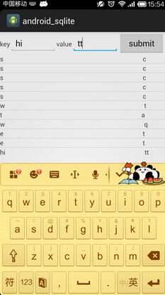 package com.app.main;import android.annotation.SuppressLint;import android.app.Activity;import android.database.Cursor;import android.database.sqlite.SQLiteDatabase;import android.os.Bundle;import android.view.View;import android.view.View.OnClickListener;import android.widget.Button;import android.widget.CursorAdapter;import android.widget.EditText;import android.widget.ListView;import android.widget.SimpleCursorAdapter;public class Main extends Activity {EditText ed1 = null;EditText ed2 = null;Button btn = null;ListView lv = null;SQLiteDatabase db = null;@Overrideprotected void onCreate(Bundle savedInstanceState) {super.onCreate(savedInstanceState);setContentView(R.layout.main);ed1 = (EditText) this.findViewById(R.id.keys);ed2 = (EditText) this.findViewById(R.id.values);btn = (Button) this.findViewById(R.id.btn);lv = (ListView) this.findViewById(R.id.lv);db = SQLiteDatabase.openOrCreateDatabase(this.getFilesDir().toString()+ "/my.db3", null);btn.setOnClickListener(new OnClickListener() {@Overridepublic void onClick(View view) {String key = ed1.getText().toString();String value = ed2.getText().toString();try {insertData(db, key, value);Cursor cursor = db.rawQuery("select * from tb_info", null);inflateListView(cursor);} catch (Exception e) {String sql = "create table tb_info(_id integer primary key autoincrement,db_key varchar(20),db_value varchar(50))";db.execSQL(sql);insertData(db, key, value);Cursor cursor = db.rawQuery("select * from tb_info", null);inflateListView(cursor);}}});}// 向数据库中插入数据private void insertData(SQLiteDatabase db, String key, String value) {db.execSQL("insert into tb_info values (null,?,?)", new String[] { key,value });System.out.println("------------------");}// 向ListView中填充数据@SuppressLint("NewApi")public void inflateListView(Cursor cursor) {SimpleCursorAdapter adapter = new SimpleCursorAdapter(Main.this,R.layout.mytextview, cursor, new String[] { "db_key","db_value" },new int[] { R.id.listkey, R.id.listvalue },CursorAdapter.FLAG_REGISTER_CONTENT_OBSERVER);lv.setAdapter(adapter);}@Overrideprotected void onDestroy() {super.onDestroy();if (db != null && db.isOpen()) {db.close();}}}实现的效果: