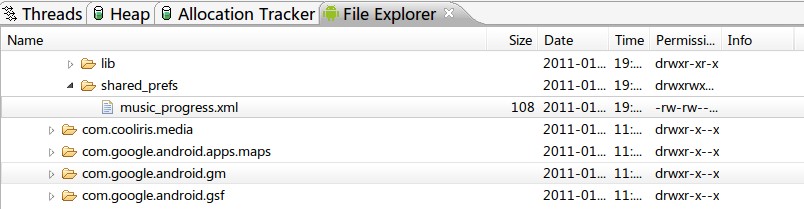 /** @author:conowen* @date:12.3.01**/ package com.conowen.sharedpreferences;import android.app.Activity; import android.content.Intent; import android.os.Bundle; import android.view.View; import android.view.View.OnClickListener; import android.widget.Button;public class SharedPreferencesActivity extends Activity { /** Called when the activity is first created. */ @Override public void onCreate(Bundle savedInstanceState) { super.onCreate(savedInstanceState); setContentView(R.layout.main); Button play = (Button) findViewById(R.id.play);Button pause = (Button) findViewById(R.id.pause);final Intent intent = new Intent(SharedPreferencesActivity.this,service.class);// 定义intent为final,全局变量,供下面两个匿名内部类(onclicklisenter)使用play.setOnClickListener(new OnClickListener() {@Overridepublic void onClick(View v) {// TODO Auto-generated method stubstartService(intent);// 开始播放,通过前面定义好的intent传递}});pause.setOnClickListener(new OnClickListener() {@Overridepublic void onClick(View v) {// TODO Auto-generated method stubstopService(intent);// 停止播放}}); } } 第二个class是继承service的,记得在manifest.XML里面注册service /** @author:conowen* @date:12.3.01**/ package com.conowen.sharedpreferences;import android.app.Service; import android.content.Intent; import android.content.SharedPreferences; import android.media.MediaPlayer; import android.os.IBinder;public class service extends Service {MediaPlayer player;// 新建播放器@Override public void onCreate() { // TODO Auto-generated method stub super.onCreate(); player = MediaPlayer.create(this, R.raw.lt26); player.setLooping(true); // 两种方式的第一个生命周期都是onCreate() }@Override public void onStart(Intent intent, int startId) { // TODO Auto-generated method stub super.onStart(intent, startId); SharedPreferences sp = this.getSharedPreferences("music_progress", MODE_PRIVATE); // music_progress为XML文件的文件名 player.seekTo(sp.getInt("progress", 0)); // progress为键值对中的key,progress所对应的值通过player.getCurrentPosition()获得,请看下面详细 // 每次调用onStart方法时,就会设置player的进度 // MediaPlayer的seekTo方法,读取进度,然后播放,getInt的第一个参数是所要读取的key名字,第二个参数为默认初始值。也就是说进度初始默认为0 player.start(); }@Override public void onDestroy() { // TODO Auto-generated method stub super.onDestroy(); SharedPreferences sp = this.getSharedPreferences("music_progress", MODE_PRIVATE); sp.edit().putInt("progress", player.getCurrentPosition()).commit(); // player.getCurrentPosition()方法获取播放进度的数据 // commit()方法是保存SharedPreferences获取来的数据 player.stop(); }@Override public IBinder onBind(Intent intent) { // TODO Auto-generated method stub return null; }} 通过SharedPreferences保存的文档如下所示,打开DDMS,切换到File Explore,在私有目录下的shared_prefs文件夹里面,路径为