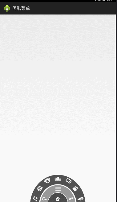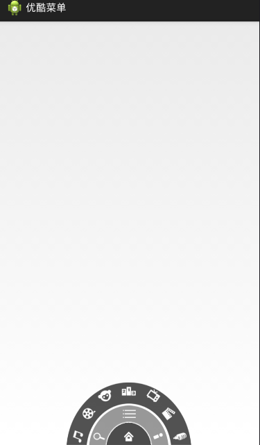 <RelativeLayout xmlns:android="http://schemas.android.com/apk/res/android"xmlns:tools="http://schemas.android.com/tools"android:layout_width="match_parent"android:layout_height="match_parent"tools:context="com.example.youkumenu.MainActivity" ><!-- 三级菜单 --><RelativeLayoutandroid:id="@+id/level3_Rl"android:layout_width="220dp"android:layout_height="110dp"android:layout_alignParentBottom="true"android:layout_centerHorizontal="true"android:background="@drawable/level3" ><ImageViewandroid:id="@+id/channel1"android:layout_marginLeft="5dp"android:layout_alignParentBottom="true" android:layout_width="wrap_content"android:layout_height="wrap_content"android:src="@drawable/channel1"/><ImageViewandroid:id="@+id/channel2"android:layout_marginBottom="10dp"android:layout_marginLeft="25dp"android:layout_above="@id/channel1"android:layout_width="wrap_content"android:layout_height="wrap_content"android:src="@drawable/channel2"/><ImageViewandroid:layout_marginBottom="1dp"android:layout_marginLeft="52dp"android:layout_above="@id/channel2"android:layout_width="wrap_content"android:layout_height="wrap_content"android:src="@drawable/channel3"/><ImageViewandroid:layout_centerHorizontal="true"android:layout_width="wrap_content"android:layout_height="wrap_content"android:src="@drawable/channel4"/><ImageViewandroid:id="@+id/channel7"android:layout_marginRight="5dp"android:layout_alignParentRight="true"android:layout_alignParentBottom="true" android:layout_width="wrap_content"android:layout_height="wrap_content"android:src="@drawable/channel7"/><ImageViewandroid:id="@+id/channel6"android:layout_alignParentRight="true"android:layout_marginBottom="10dp"android:layout_marginRight="25dp"android:layout_above="@id/channel7"android:layout_width="wrap_content"android:layout_height="wrap_content"android:src="@drawable/channel6"/><ImageViewandroid:layout_marginBottom="1dp"android:layout_marginRight="52dp"android:layout_alignParentRight="true"android:layout_above="@id/channel6"android:layout_width="wrap_content"android:layout_height="wrap_content"android:src="@drawable/channel5"/></RelativeLayout><!-- 二级菜单 --><RelativeLayoutandroid:id="@+id/level2_Rl"android:layout_width="140dp"android:layout_height="70dp"android:layout_alignParentBottom="true"android:layout_centerHorizontal="true"android:background="@drawable/level2" ><ImageViewandroid:layout_marginLeft="3dp"android:layout_alignParentBottom="true"android:layout_width="wrap_content"android:layout_height="wrap_content"android:src="@drawable/icon_search"/><ImageViewandroid:id="@+id/menu_Iv"android:layout_centerHorizontal="true"android:layout_width="wrap_content"android:layout_height="wrap_content"android:src="@drawable/icon_menu"/><ImageViewandroid:id="@+id/myyouku_Iv"android:layout_marginRight="3dp"android:layout_alignParentBottom="true"android:layout_alignParentRight="true"android:layout_width="wrap_content"android:layout_height="wrap_content"android:src="@drawable/icon_myyouku"/></RelativeLayout><!-- 一级菜单 --><RelativeLayoutandroid:layout_width="80dp"android:layout_height="40dp"android:layout_alignParentBottom="true"android:layout_centerHorizontal="true"android:background="@drawable/level1" ><ImageViewandroid:id="@+id/home_Iv"android:layout_centerInParent="true"android:layout_width="wrap_content"android:layout_height="wrap_content"android:src="@drawable/icon_home" /></RelativeLayout></RelativeLayout>那好,布局写好,就能看到这样的效果,只不过现在只是静态的,没有加逻辑而已