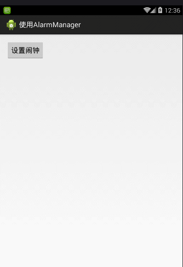 public class MainActivity extends Activity { private AlarmManager alarmManager; @Override protected void onCreate(Bundle savedInstanceState) {super.onCreate(savedInstanceState);setContentView(R.layout.activity_main);//获取AlarmManager对象alarmManager= (AlarmManager) getSystemService(ALARM_SERVICE); } public void btn(View view) {final Calendar c = Calendar.getInstance();TimePickerDialog dialog = new TimePickerDialog(this,new OnTimeSetListener() { //延迟意图(即闹钟的意图) PendingIntent paIntent = PendingIntent.getActivity(MainActivity.this,1, new Intent(MainActivity.this,SecondActivity.class),PendingIntent.FLAG_UPDATE_CURRENT); @Override public void onTimeSet(TimePicker view, int hourOfDay, int minute) {//设置你所选择的时间c.set(Calendar.HOUR_OF_DAY, hourOfDay);c.set(Calendar.MINUTE, minute);//第一个参数指定闹钟服务的类型//第二个参数指定闹钟间隔的时间//第三个参数指跳转闹钟的延迟意图alarmManager.set(AlarmManager.RTC_WAKEUP, c.getTimeInMillis(), paIntent); }}, //闹钟的初始值(时和分)c.get(Calendar.HOUR_OF_DAY),c.get(Calendar.MINUTE), true);dialog.show(); }}布局:<RelativeLayout xmlns:android="http://schemas.android.com/apk/res/android" xmlns:tools="http://schemas.android.com/tools" android:layout_width="match_parent" android:layout_height="match_parent" android:paddingBottom="@dimen/activity_vertical_margin" android:paddingLeft="@dimen/activity_horizontal_margin" android:paddingRight="@dimen/activity_horizontal_margin" android:paddingTop="@dimen/activity_vertical_margin" tools:context="com.example.alarmmanager.MainActivity" > <Buttonandroid:onClick="btn"android:layout_width="wrap_content"android:layout_height="wrap_content"android:text="@string/btntext" /></RelativeLayout>以上就是本文的全部内容,希望对大家学习android软件编程有所帮助。