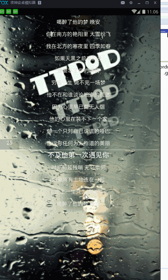 public class VerticalScrollTextView extends TextView implements Runnable{ //绘制歌词画笔 private Paint mContentPaint; //绘制基线画笔 private Paint mLinePaint; //绘制滑动进度背景画笔 private Paint mRectPaint; //歌词数据 private List<Sentence> mDataList; //行数 private int index = 0 ; //当前view的宽 private float mX; //当前view的高 private float mY; //当前view垂直方向中线 private float middleY; //行与行之间的间距 private final static int DY = 80 ; //歌词文字大小 private int mTextSize = 35; //歌词中间字体的大小 private int mBigTextSize = 45; //当前是否按下 private boolean isTouch = false ; //上一次触摸view的y轴坐标 private float mLastY; //是否正在滑动 private boolean isMoving; //记录上一次滑动的时间 private long lastMoveTime; //滑动速度追踪类 private VelocityTracker mVelocityTracker; //滑动最大速度 private int mMaximumVelocity; //歌词是否为空 private boolean isEmpty; public VerticalScrollTextView(Context context) { this(context,null); } public VerticalScrollTextView(Context context, AttributeSet attrs) { this(context, attrs,0); } public VerticalScrollTextView(Context context, AttributeSet attrs, int defStyleAttr) { super(context, attrs, defStyleAttr); //获取最大的滑动速度值 mMaximumVelocity = ViewConfiguration.get(context).getScaledMaximumFlingVelocity(); init(); } private void init(){ setFocusable(true); setClickable(true); //歌词为空设置默认值 if(mDataList==null){mDataList = new ArrayList<>();Sentence sentence = new Sentence(0,"没有获取到歌词",0);mDataList.add(sentence);isEmpty = true ; } //初始化歌词画笔 mContentPaint = new Paint(); mContentPaint.setTextSize(mTextSize); mContentPaint.setAntiAlias(true); mContentPaint.setColor(Color.parseColor("#e5e2e2")); //设置为serif字体 mContentPaint.setTypeface(Typeface.SERIF); //设置字体为居中 mContentPaint.setTextAlign(Paint.Align.CENTER); //初始化基线画笔 mLinePaint = new Paint(); mLinePaint.setAntiAlias(true); mLinePaint.setStrokeWidth(1); mLinePaint.setColor(Color.WHITE); //进度背景颜色画笔 mRectPaint = new Paint(); mLinePaint.setAntiAlias(true); mRectPaint.setColor(Color.parseColor("#66666666")); } @Override protected void onDraw(Canvas canvas) { super.onDraw(canvas); //如果当前进度为-1,直接返回,不用绘制 if (index == -1)return; Sentence sentence = mDataList.get(index); //绘制中间行的歌词,设置为高亮白色,大字体 mContentPaint.setColor(Color.WHITE); mContentPaint.setTextSize(mBigTextSize); canvas.drawText(sentence.getName(), mX/2, middleY, mContentPaint); //当前为歌词不为空并且按下的情况下,绘制基线和进度 if(!isEmpty&&isTouch){//获取中间行字体最高的位置float baseLine = middleY-Math.abs(mContentPaint.ascent());//绘制进度背景canvas.drawRect(10.0f,baseLine-70,150.0f,baseLine,mRectPaint);//绘制基线canvas.drawLine(10.0f,baseLine,mX-10,baseLine,mLinePaint);//设置进度字体大小mContentPaint.setTextSize(mTextSize);//绘制进度字体canvas.drawText(String.valueOf(index),85,baseLine-35,mContentPaint); } //初始化isEmpty isEmpty = false ; //初始化歌词内容画笔 mContentPaint.setColor(Color.parseColor("#e5e2e2")); mContentPaint.setTextSize(mTextSize); //暂时保存中间线位置,来绘制中间线以上的行数字体 float tempY = middleY; //绘制中间线以上的歌词 for (int i = index - 1; i >= 0; i--) {tempY = tempY - DY;if (tempY < 0) {break;}Sentence preSentence = mDataList.get(i);canvas.drawText(preSentence.getName(), mX/2, tempY, mContentPaint); } tempY = middleY; //绘制中间线以下的歌词 for (int i = index + 1; i < mDataList.size(); i++) {tempY = tempY + DY;if (tempY > mY) {break;}Sentence nexeSentence = mDataList.get(i);canvas.drawText(nexeSentence.getName(), mX/2, tempY, mContentPaint); } //初始化isMoving,到这里表示滑动结束 isMoving = false ; } protected void onSizeChanged(int w, int h, int ow, int oh) { super.onSizeChanged(w, h, ow, oh); //获取view的宽和高 mX = w; mY = h; middleY = h * 0.5f; } public long updateIndex(int index) { if (index == -1)return -1; this.index=index; return index; } public List<Sentence> getDataList() { return mDataList; } public void setDataList(List<Sentence> mDataList){ this.mDataList = mDataList ; } public void updateUI(){ new Thread(this).start(); } @Override public boolean onTouchEvent(MotionEvent event) { int action = event.getAction(); switch (action){case MotionEvent.ACTION_DOWN:isTouch =true;mLastY = event.getY();break;case MotionEvent.ACTION_MOVE://创建速度追踪器initVelocityTrackerIfNotExists();mVelocityTracker.addMovement(event);mVelocityTracker.computeCurrentVelocity(1000, mMaximumVelocity);//获取当前速度。默认为100float velocity = mVelocityTracker.getYVelocity()==0?100:mVelocityTracker.getYVelocity();long currentTime = System.currentTimeMillis();//设置一个固定值和速度结合决定滑动更新的快慢if(!isMoving&¤tTime-lastMoveTime>20000/Math.abs(velocity)){ isMoving = true ; lastMoveTime = System.currentTimeMillis(); float currentY = event.getY(); float mMoveY = currentY - mLastY; //向上滑动-1向下滑动+1 int newIndex = mMoveY>0?index - 1:index+1; //循环滚动 newIndex=newIndex<0?mDataList.size()-1:newIndex>=mDataList.size()?0:newIndex; updateIndex(newIndex); invalidate(); mLastY = currentY;}break;case MotionEvent.ACTION_UP:isTouch = false ;recycleVelocityTracker();break; } return super.onTouchEvent(event); } @Override public void run() { //自动滚动刷新的时间间隔 long time = 1000; //控制进度 int i=0; while (true) {//当前不在按下的情况下自动滚动if(!isTouch){//设置当前的进度值long sleeptime = updateIndex(i);//使用handle刷新uimHandler.post(mUpdateResults);if (sleeptime == -1) return;try { Thread.sleep(time); i++; //当到了最后一行的时候自动跳转到第一行 if(i==getDataList().size()) i=0;} catch (InterruptedException e) { e.pri