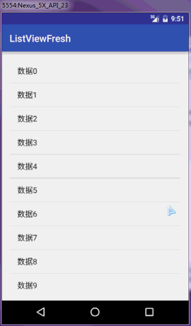 int result1; int result2; //监听状态改变 @Override public void onScrollStateChanged(AbsListView view, int scrollState) { switch (scrollState) { case SCROLL_STATE_IDLE: //滑动结束 break; case SCROLL_STATE_FLING: //手指离开屏幕 if (result1 >= result2) {//只发送一次,防止多次加载数据if (!mHandler.hasMessages(LOAD))mHandler.sendEmptyMessageDelayed(LOAD, 5000); } break; case SCROLL_STATE_TOUCH_SCROLL: //滑动中 break; } } //滑动结束之后执行 @Override public void onScroll(AbsListView view, int firstVisibleItem, int visibleItemCount, int totalItemCount) { // Log.e(TAG, "firstVisibleItem:" + firstVisibleItem + "---visibleItemCount:" + visibleItemCount + "--totalItemCount:" + totalItemCount); //加载到最后 if (firstVisibleItem + visibleItemCount >= totalItemCount) { //这里不处理,在上面状态改变结束之后再处理 } }4、下拉加刷新原理及实现 mListView.setOnTouchListener(new View.OnTouchListener() { @Override public boolean onTouch(View v, MotionEvent event) { switch (event.getAction()) {case MotionEvent.ACTION_DOWN:startY=event.getY();break;case MotionEvent.ACTION_MOVE:break;case MotionEvent.ACTION_UP:endY=event.getY();if(endY-startY> DISTANT&&(mListView.getFirstVisiblePosition()==1||mListView.getFirstVisiblePosition()==0)){if(!mHandler.hasMessages(FRESH)){mProgressBar_top.setVisibility(View.VISIBLE);//notifmHandler.sendEmptyMessageDelayed(FRESH,5000);}}break; } //不能返回true,不然直接消费掉了 return false; } });以上就是本文的全部内容,希望对大家学习Android软件编程有所帮助。