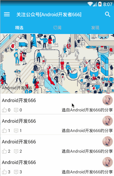 从gif动态效果图中我们可以看出,最外层有三个tab(精选,订阅,发现),在精选界面顶部有一个轮播的图片广告,广告下面是一个精选文章列表。