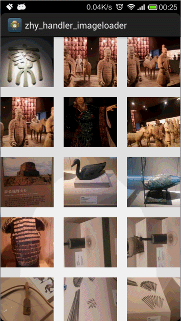 3、GridView的适配器package com.example.zhy_handler_imageloader;import java.util.List;import android.content.Context; import android.view.LayoutInflater; import android.view.View; import android.view.ViewGroup; import android.widget.BaseAdapter; import android.widget.ImageView;import com.zhy.utils.ImageLoader;public class MyAdapter extends BaseAdapter { private Context mContext;private List<String> mData;private String mDirPath;private LayoutInflater mInflater;private ImageLoader mImageLoader; public MyAdapter(Context context, List<String> mData, String dirPath){ this.mContext = context; this.mData = mData; this.mDirPath = dirPath; mInflater = LayoutInflater.from(mContext);mImageLoader = ImageLoader.getInstance();} @Overridepublic int getCount(){ return mData.size();} @Overridepublic Object getItem(int position){ return mData.get(position);} @Overridepublic long getItemId(int position){ return position;} @Overridepublic View getView(int position, View convertView, final ViewGroup parent){ ViewHolder holder = null; if (convertView == null) {holder = new ViewHolder();convertView = mInflater.inflate(R.layout.grid_item, parent,false);holder.mImageView = (ImageView) convertView.findViewById(R.id.id_item_image);convertView.setTag(holder); } else {holder = (ViewHolder) convertView.getTag(); } holder.mImageView .setImageResource(R.drawable.friends_sends_pictures_no); //使用Imageloader去加载图片 mImageLoader.loadImage(mDirPath + "/" + mData.get(position), holder.mImageView); return convertView;} private final class ViewHolder{ ImageView mImageView;}} 可以看到与传统的适配器的写法基本没有什么不同之处,甚至在getView里面都没有出现常见的回调(findViewByTag~用于防止图片的错位);仅仅多了一行代码: