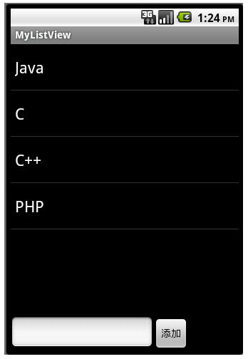 public class MyListView extends ListActivity { private ArrayAdapter<CharSequence> mAdapter; private ListView mListView; private EditText mLanguageText; private Button mAddButton;/** Called when the activity is first created. */ @Override public void onCreate(Bundle savedInstanceState) { super.onCreate(savedInstanceState); setContentView(R.layout.mylist1);//get the view mListView = getListView(); mLanguageText = (EditText) findViewById(R.id.addLangEdit); mAddButton = (Button) findViewById(R.id.addButton);//array adapter created from string array resources mAdapter = ArrayAdapter.createFromResource(this, R.array.language, android.R.layout.simple_list_item_1); //set the adapter mListView.setAdapter(mAdapter);//add listener mAddButton.setOnClickListener(mOnClickListener); }private OnClickListener mOnClickListener = new View.OnClickListener() { @Override public void onClick(View v) {String text = mLanguageText.getText().toString();if(null == text || "".equals(text.trim())) {Toast.makeText(MyListView.this, "输入不能为空", Toast.LENGTH_SHORT).show();}else {mAdapter.add(text);mAdapter.notifyDataSetChanged();mLanguageText.setText("");} } };}