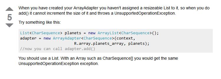 界面成功显示,可是每次点击“添加”,就会抛出java.lang.UnsupportedOperationException,这看似很匪夷所思,因为按照android的api文档,确实能通过adapter上的add、remove等方法在运行时增删列表项啊,那问题到底出在哪里呢?