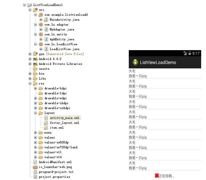 <RelativeLayout xmlns:android="http://schemas.android.com/apk/res/android" xmlns:tools="http://schemas.android.com/tools" android:layout_width="match_parent" android:layout_height="match_parent" > <com.lx.loadListView.LoadListViewandroid:id="@+id/list"android:layout_width="match_parent"android:layout_height="wrap_content"android:layout_alignParentTop="true"android:layout_centerHorizontal="true"android:cacheColorHint="#00000000" > </com.lx.loadListView.LoadListView></RelativeLayout>然后为了实现ListView的这种效果,我们需要一个自定义的ListView,并在上面的布局文件中引用我们自定义的ListView,代码如下: