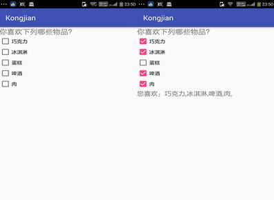 public class CheckChoose extends AppCompatActivity implements CompoundButton.OnCheckedChangeListener { private CheckBox cb1,cb2,cb3,cb4,cb5;private TextView tv;@Overrideprotected void onCreate(Bundle savedInstanceState) { super.onCreate(savedInstanceState); setContentView(R.layout.check_choose);tv= (TextView) this.findViewById(R.id.tv); cb1= (CheckBox) this.findViewById(R.id.cb1); cb2= (CheckBox) this.findViewById(R.id.cb2); cb3= (CheckBox) this.findViewById(R.id.cb3); cb4= (CheckBox) this.findViewById(R.id.cb4); cb5= (CheckBox) this.findViewById(R.id.cb5); cb1.setOnCheckedChangeListener(this); cb2.setOnCheckedChangeListener(this); cb3.setOnCheckedChangeListener(this); cb4.setOnCheckedChangeListener(this); cb5.setOnCheckedChangeListener(this);} @Overridepublic void onCheckedChanged(CompoundButton buttonView, boolean isChecked) { String str="您喜欢:"; if(cb1.isChecked()){str+=cb1.getText()+","; } if(cb2.isChecked()){str+=cb2.getText()+","; } if(cb3.isChecked()){str+=cb3.getText()+","; } if(cb4.isChecked()){str+=cb4.getText()+","; } if(cb5.isChecked()){str+=cb5.getText()+","; } tv.setText(str);} } 效果图: