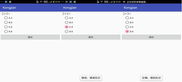 public class SingChoose extends AppCompatActivity {private Button btn;private RadioButton rbD;@Overrideprotected void onCreate(Bundle savedInstanceState) { super.onCreate(savedInstanceState); setContentView(R.layout.sing_choose);rbD= (RadioButton) this.findViewById(R.id.rb4); btn= (Button) this.findViewById(R.id.submit); btn.setOnClickListener(new View.OnClickListener() {@Overridepublic void onClick(View v) { if(rbD.isChecked()){Toast.makeText(SingChoose.this,"正确,请加五分",Toast.LENGTH_SHORT).show(); } else {Toast.makeText(SingChoose.this,"错误,请减五分",Toast.LENGTH_SHORT).show(); }} });} } 效果图: