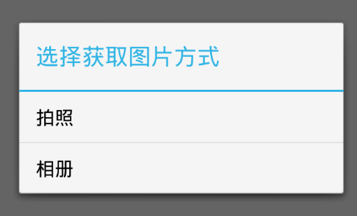 public static void showImagePickDialog(final Activity activity){ String title = "选择获取图片方式"; String[] items = new String[]{"拍照","相册"}; new AlertDialog.Builder(activity).setTitle(title).setItems(items, new DialogInterface.OnClickListener() { @Override public void onClick(DialogInterface dialog, int which) { dialog.dismiss(); switch (which){ case 0: //选择拍照 pickImageFromCamera(activity); break; case 1: //选择相册 pickImageFromAlbum(activity); break; default: break;} }}).show(); }