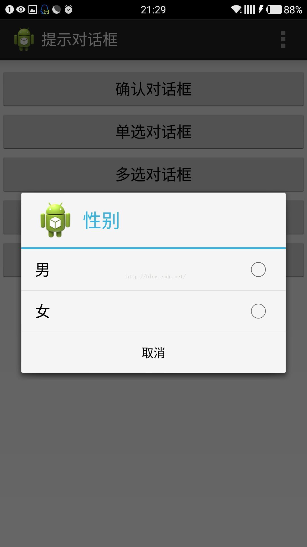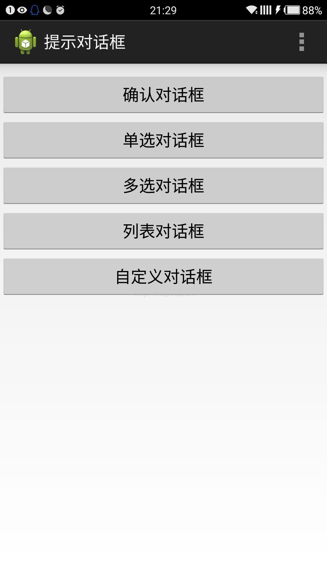 程序运行,显示图一的几个按钮,点击按钮分别显示图二到图六的对话框,点击对话框的某一项或者按钮,也会显示相应的吐司输出。